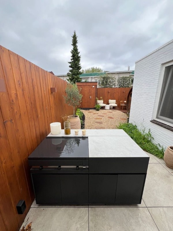 In de tuin is de bestaande sauna volledig vernieuwd. Ook is er een buitenkeuken gerealiseerd in de tuin in Den Bosch.
