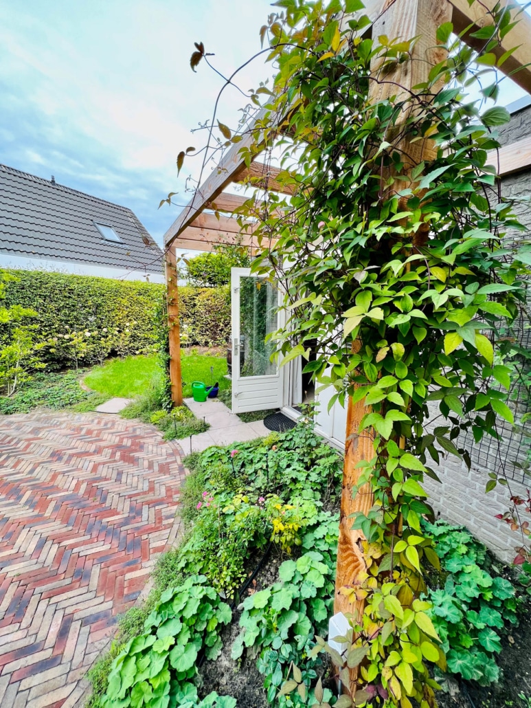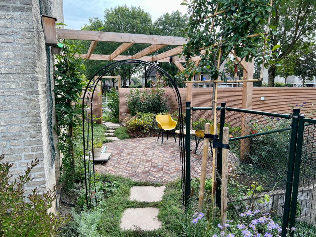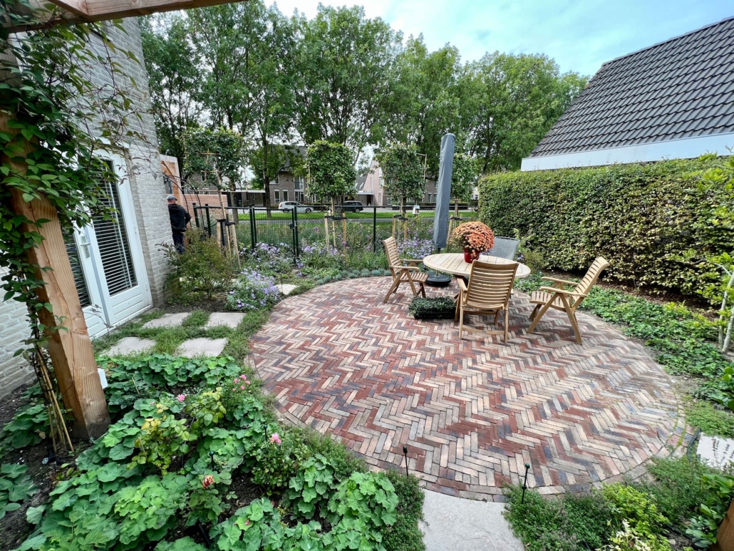 Deze tuineigenaar wilde graag een botanische tuin. Oftewel; we mochten flink los gaan met de beplanting! In de voortuin hebben we twee grote borders van stapelblokken geplaatst. Deze strakke borders zijn vervolgens op symmetrische wijze gevuld met weelderige beplanting en kleurrijke bloemen. Het pad naar de voordeur is gelegd met Geo Ceramica tegels. Dit pad is verder doorgetrokken naar stap tegels die naar de achtertuin leiden. Door groen tussen de tegels te laten heeft de bewoonster heel bewust gekozen voor een rustieke uitstraling. De oprit bij de woning is gelegd met gebakken waaltjes. Deze tegels hebben wij ook gebruikt voor het terras in de achtertuin waardoor de voor- en achtertuin samen een geheel zijn.