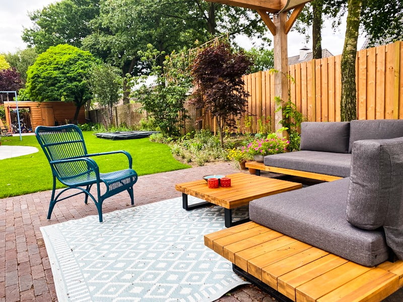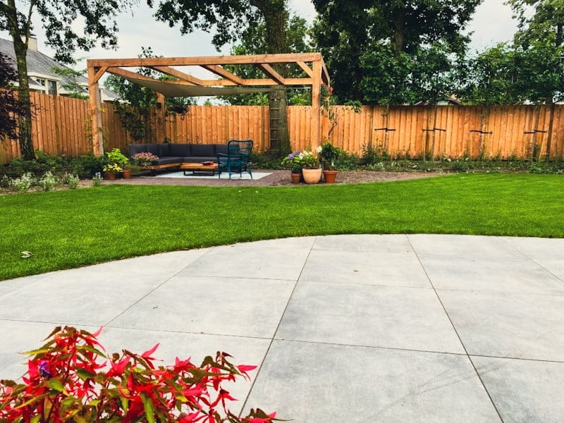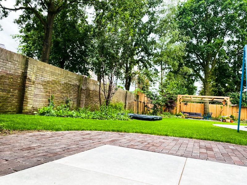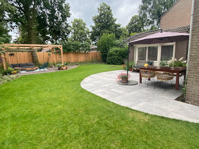 Als eerst zijn we begonnen met het verwijderen van de oude tuin. We hebben alles netjes afgevoerd. Hierna hebben wij sleuven gegraven voor het beregeningssysteem. Daarna volgt het bestraten van de terrassen. Bij deze tuin kwam behoorlijk wat houtwerken kijken: de schutting, de schuur met kleine overkapping voor de fietsen en de pergola. In de laatste fase beginnen we het met leggen van het gazon en het planten van de beplanting en de bomen. Ook brengen we in deze laatste fase de verlichting aan.