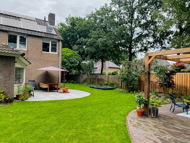 In Rosmalen hebben we onlangs deze gehele tuinrenovatie uitgevoerd. In eerste gesprek ging Björn met de klant in gesprek over de wensen. Het wensenlijstje was behoorlijk: een niet te strakke tuin, maar een echte leeftuin of familietuin. Verder moest er ruimte komen voor een nieuwe schuur voor de fietsen, voldoende terrassen met keramische tegels, een nieuw gazon en nieuwe schutting en een beplantings- en beregeningsplan. Björn ging aan de slag met deze wensen en besloot een pergola toe te voegen aan het ontwerp. De klant was erg enthousiast over het ontwerp en we konden aan de slag!