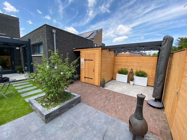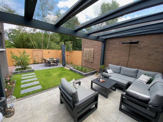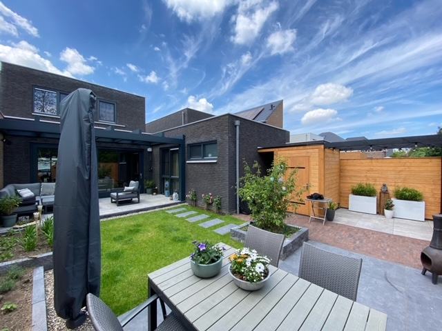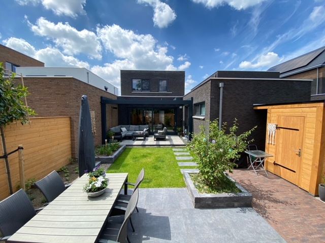 Onlangs hebben wij in Geffen een prachtige moderne voor- en achtertuin aangelegd. Omdat het om een moderne nieuwbouwwoning ging was het belangrijk dat de tuin ook een moderne uitstraling zou krijgen. Voor de klant was het belangrijk dat er een gezellige sfeer werd gecreëerd in de achtertuin met twee terrassen. Men wilde een overkapping aan het huis. En een terras achterin de tuin om buiten in de zon te kunnen zitten. Gras, mooie tegels en de mogelijkheid om spullen op te bergen, zoals tuingereedschap en grasmaaier.