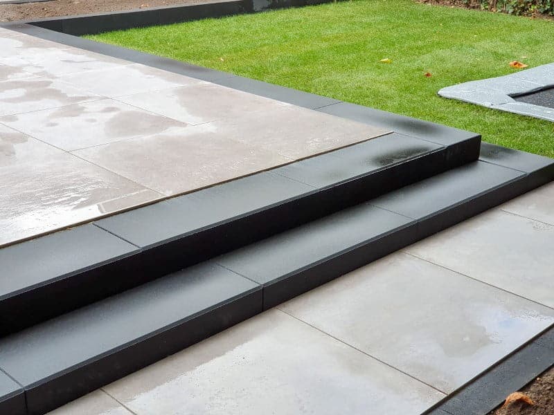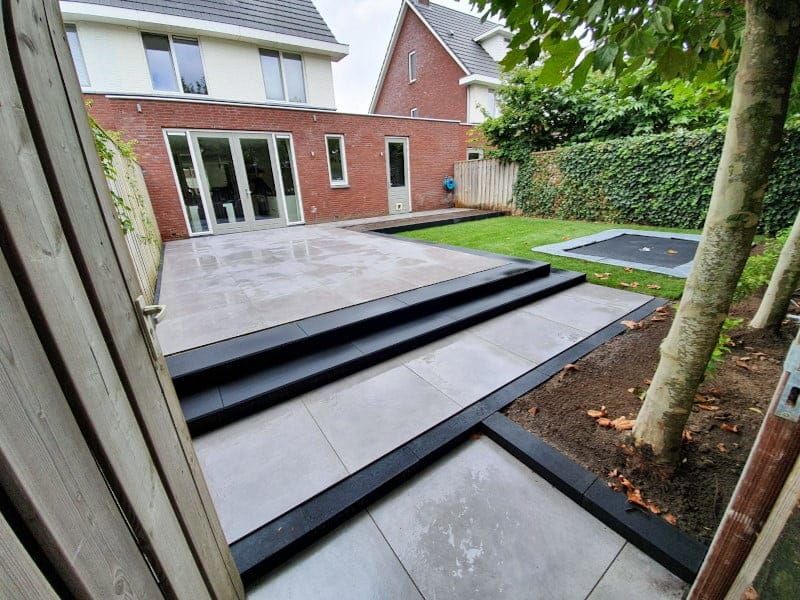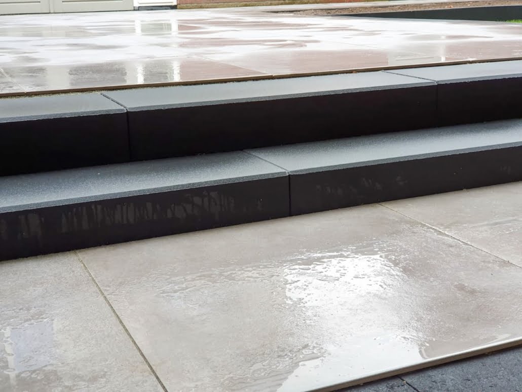 De bestrating van de traptreden moest gemaakt zijn van keramische tegels. Keramische tegels geven een luxe uitstraling. Door met verschillende hoogtes en kleurverschillen te werken, krijgt de tuin meer diepgang. De traptreden die donkerder zijn, matchen mooi met de keramische tegels. Hierdoor krijgt de tuin al snel een luxueuze uitstraling.