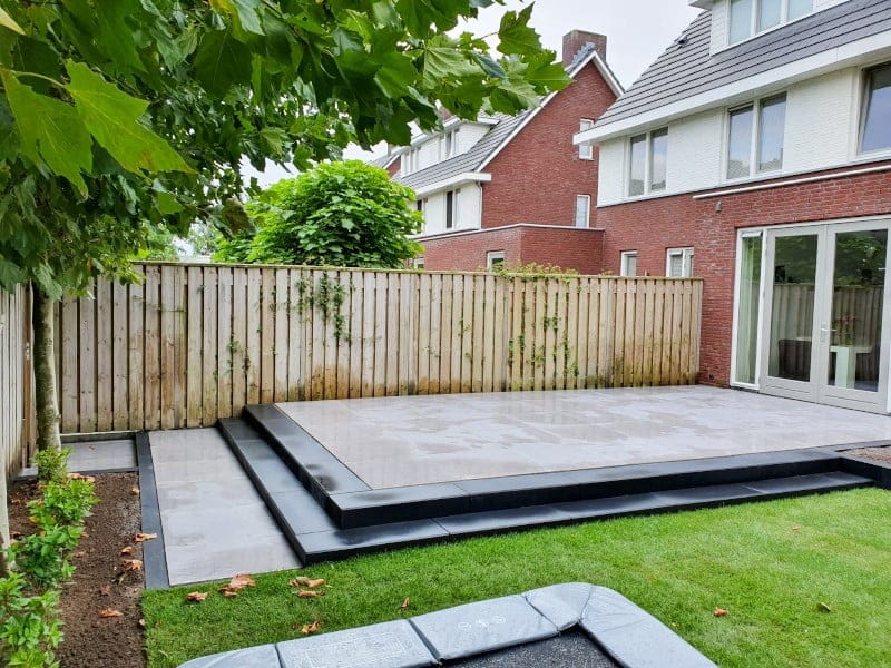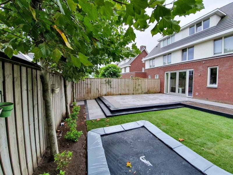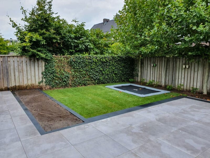 Deze opdrachtgever in Rosmalen (Noord-Brabant) wilde een nieuwe tuin laten aanleggen waarbij ook een trap in de tuin werd gecreëerd. De trap in tuin trend zien we steeds vaker voorbij komen. Veel nieuwbouwhuizen hebben een tuin die afloopt, waarvoor een trap in de tuin de ideale oplossing is. De traptreden moesten van keramische tegels zijn. Verder wilden ze veel groen in de tuin en een trampoline, zodat kinderen ook veel plezier van de tuin beleven. Na het maken van een tuinschets en een passende offerte voor tuinaanleg ging de opdrachtgever akkoord en kon het tuinproject worden ingepland.