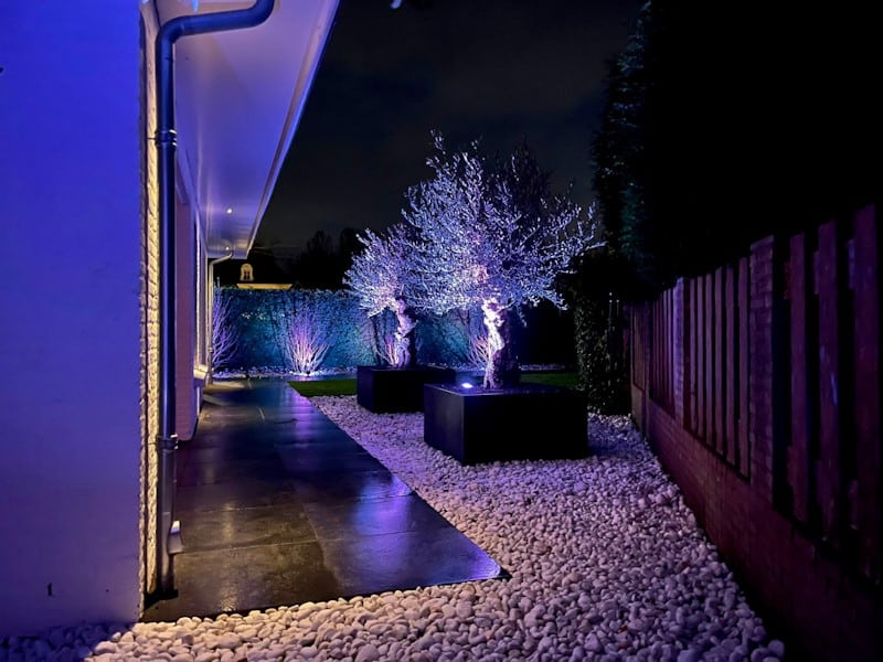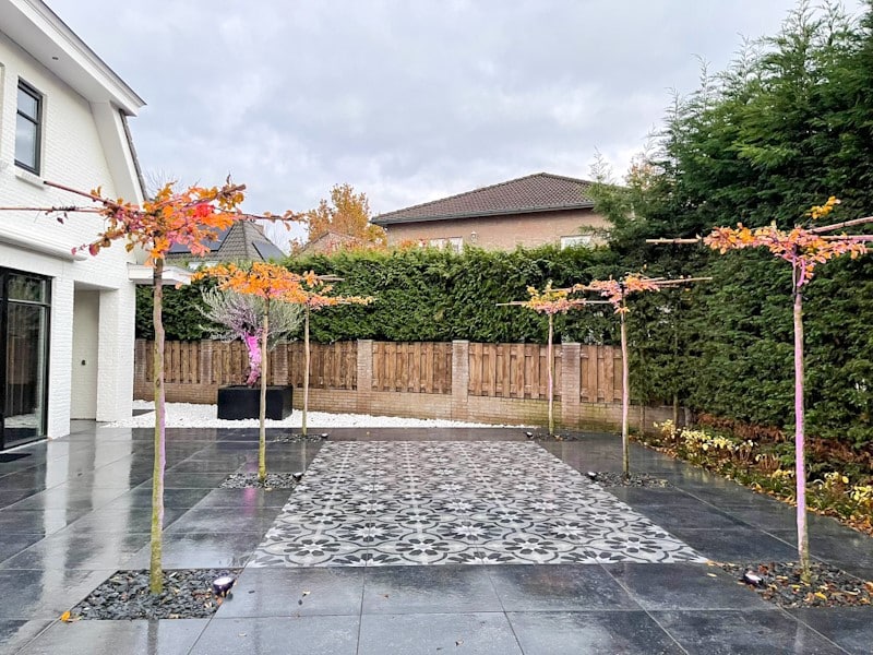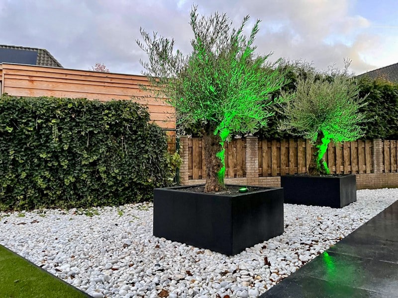 Er is gekozen om drie prachtige olijfbomen te plaatsen in een zwarte Adezz pot. De olijfbomen geven het mediterraans tintje aan de tuin. De strakke, zwarte plantenbakken van topmerk Adezz creëren een luxe uitstraling.