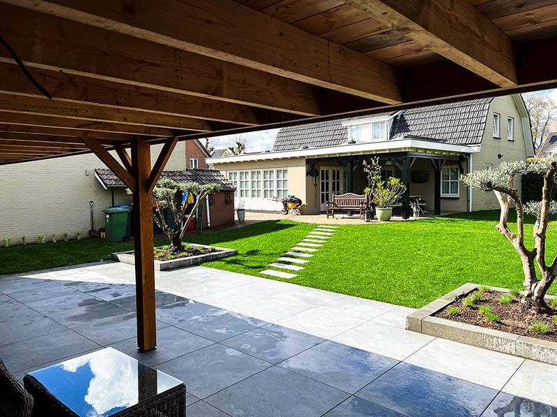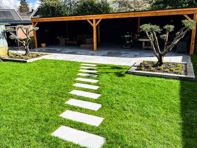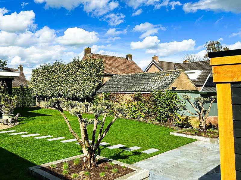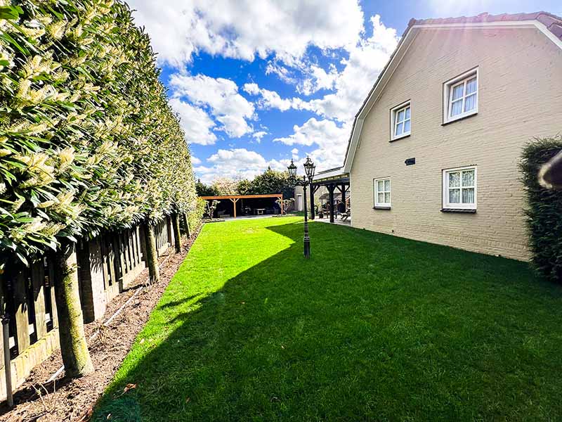 De klant wilde graag een tuin met relatief weinig onderhoud. Zo nu en dan het gras maaien is geen probleem, maar de bewoners zaten niet te wachten op een tuin waarbij zij met enige regelmaat op hun knieën de tuin in moesten duiken. Door subtiel gebruik te maken van groenigheid, met hier en daar wat eyecatchers, en een groot deel te bestraten, zorgen wij ervoor dat de bewoners kunnen genieten van een sfeervolle, groene tuin, zonder zich daarbij al te veel zorgen te hoeven maken over het onderhoud van de tuin.